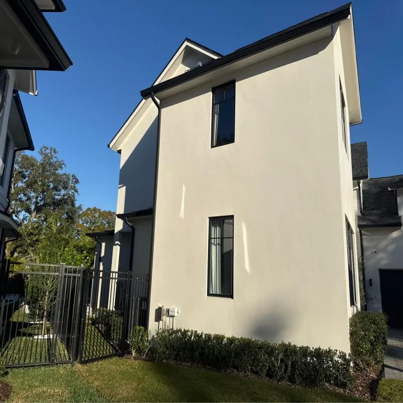 The scope centered on thorough Tampa gutter cleaning to remove debris and restore drainage across first and second levels, including hand removal of blockages from gutters and downspouts, clearing rooftop debris with a blower, and re-seating deformed push-fit guards. We paired this with our Soft Wash house wash for stucco, fascia, soffits, and attached railings, plus premium exterior window cleaning of glass, frames, and sills. We also performed high-pressure patio cleaning on the front and rear porches and the outdoor shower area, followed by post-treatment to deter organic regrowth.