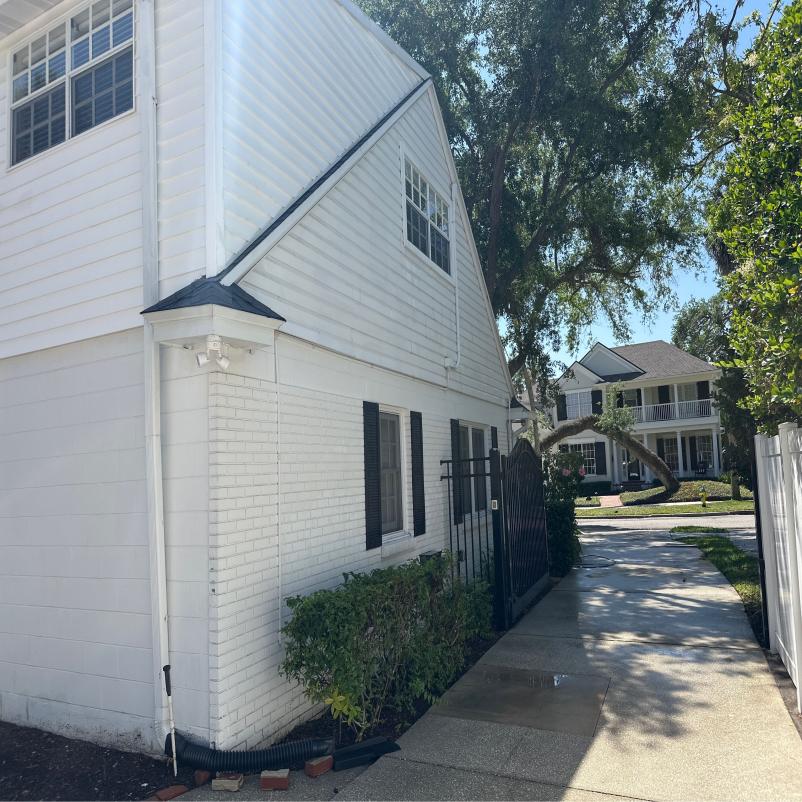 Our house washing and gutter cleaning services included comprehensive cleaning of the painted brick siding, soffits, the outside of the gutters, fascia, and window frames. The project also extended to pressure washing the driveways, sidewalks, front walkway, back patio, pool decking, and the enclosed porch. Finally, we took on the gutter cleaning task, clearing out every bit of debris from the gutters and downspouts.The client had a special request to remove rust stains from irrigation and hard water stains after rinsing. They expected a sparkling clean exterior, and we were committed to fulfilling this expectation.